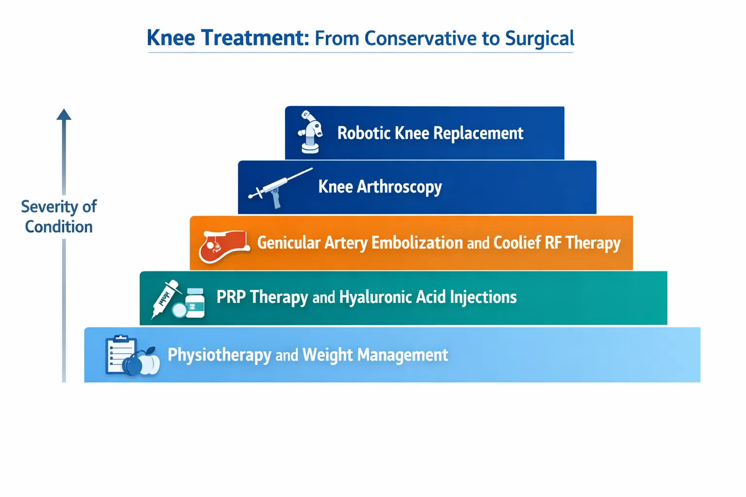 Genicular Artery Embolization (GAE): A minimally invasive procedure that reduces blood supply to inflamed knee tissue. It is highly effective for OA-related pain and is not widely available in India.