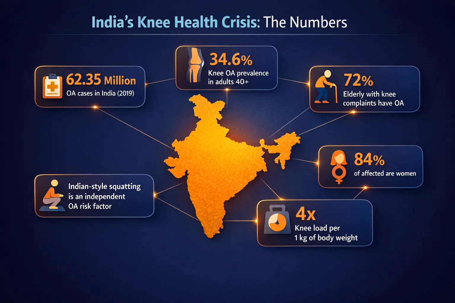 India's knee OA burden is staggering and growing. According to Global Burden of Disease Study 2019 data published in ScienceDirect, India had approximately 62.35 million people living with osteoarthritis in 2019, up from 23.46 million in 1990. That is nearly a 170% increase in three decades. A 2024 community study in rural South India (PMC) found that 34.6% of adults aged 40 and above had diagnosable knee OA. And a 2025 systematic review and meta-analysis (ResearchGate/PMC) found that among older Indians presenting with knee complaints, 72% had osteoarthritis, 84% of them women.