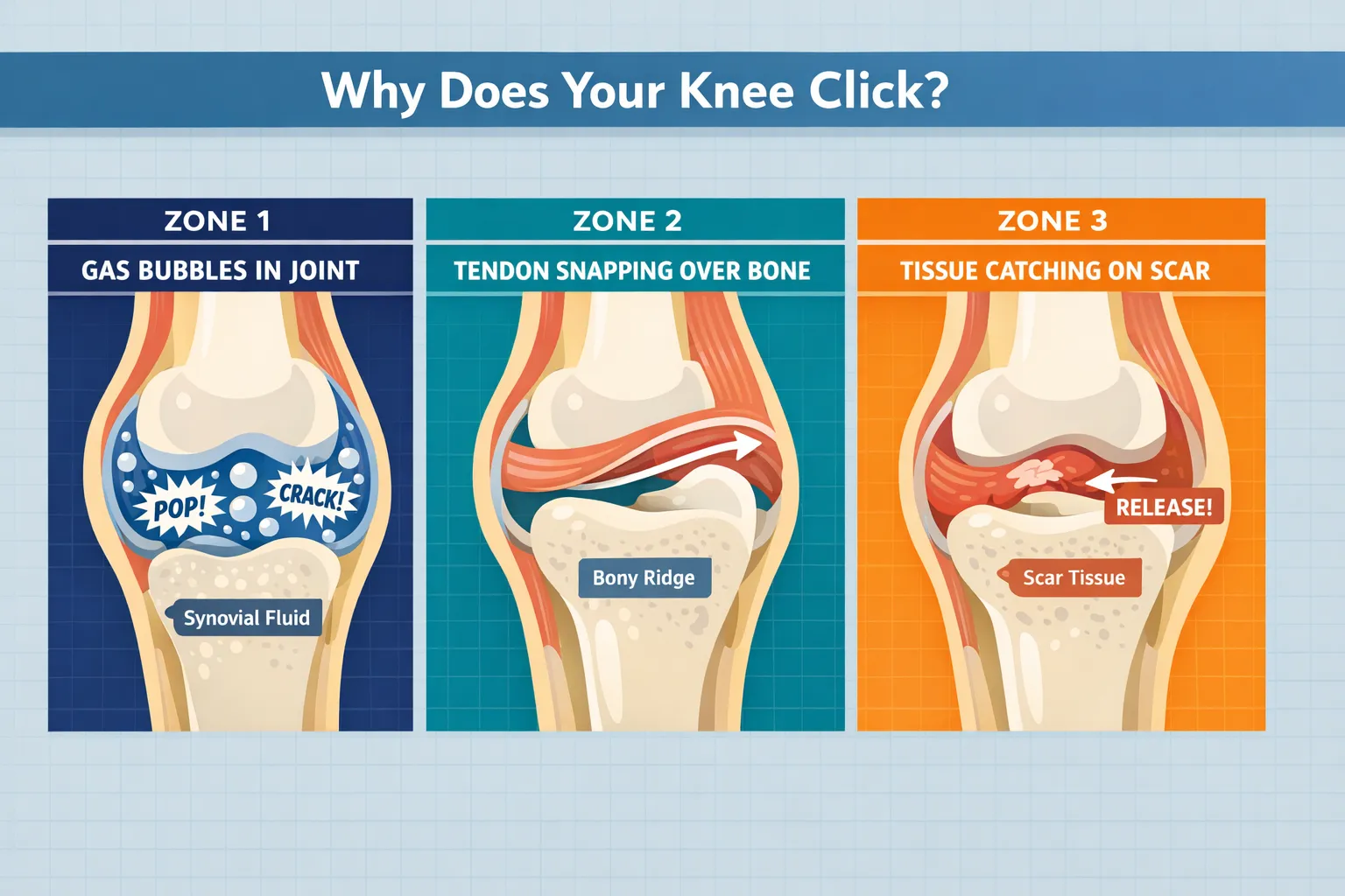 Most knee clicking is harmless, caused by gas bubbles releasing in joint fluid, tendons snapping over bony structures, or soft tissue briefly catching and releasing. None of these require treatment.