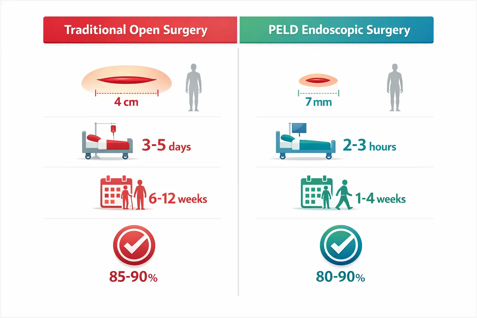 Recurrence (6.3%): Your disc can herniate again at the same level. Usually happens within two years. The good news? It can often be re-treated with PELD.