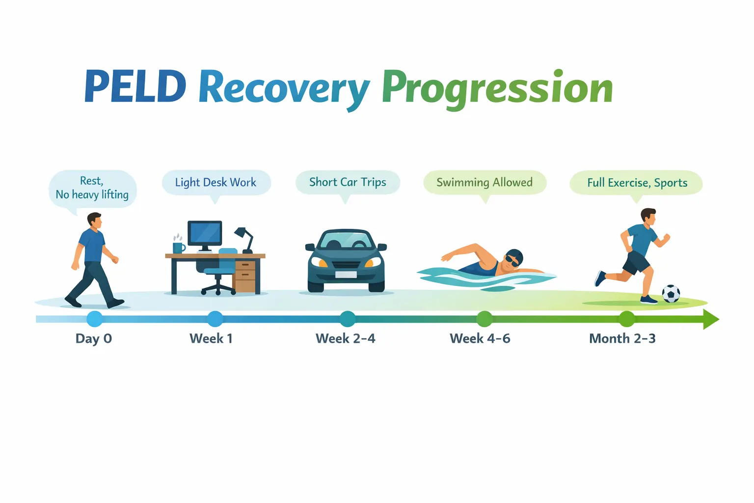 Weeks 4-6: Most people return to their jobs. You can swim, walk longer distances, resume most normal activities. Heavy lifting and contact sports? Still off the table.