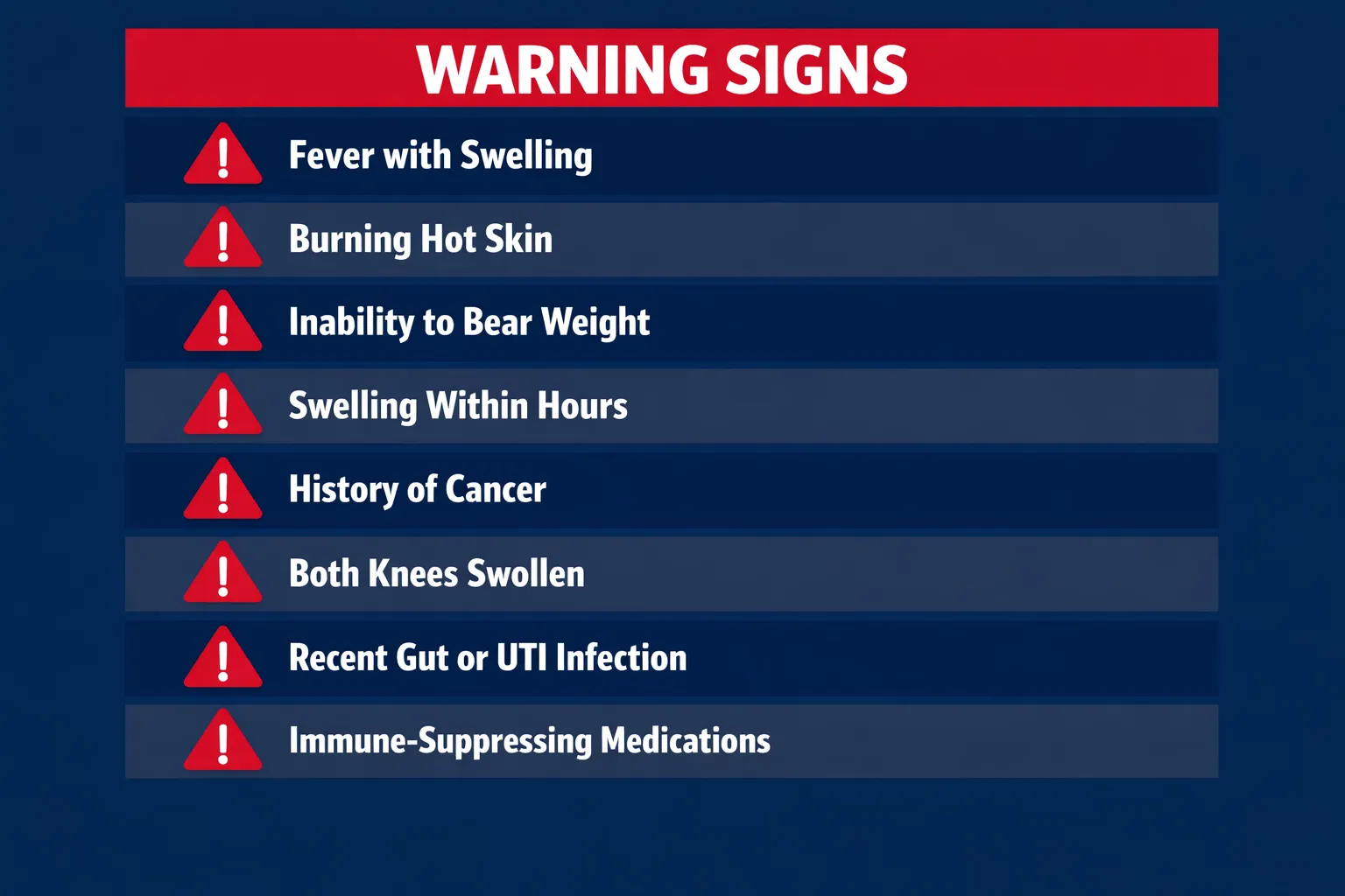 Most causes of non-traumatic knee swelling are not emergencies. But some absolutely are. Here is when you should seek care immediately: